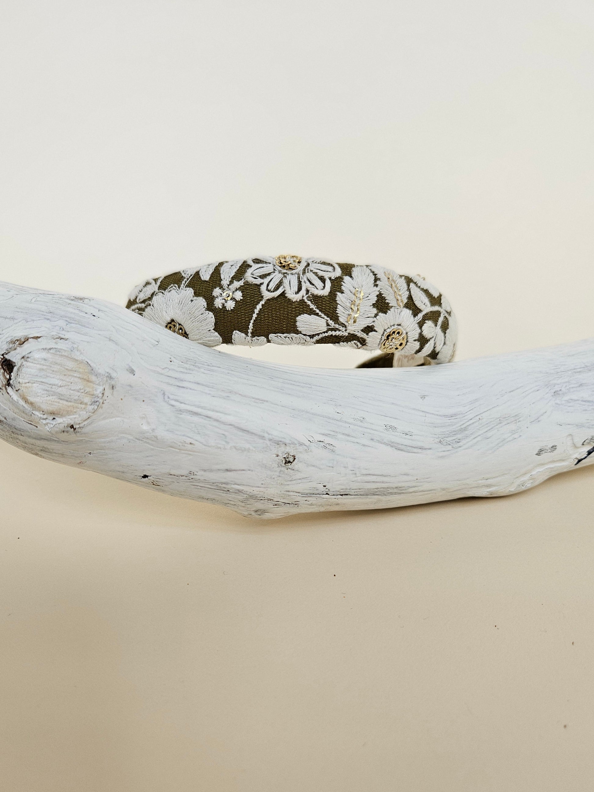Introducing our headband Eden, a handmade and padded accessory that offers a nice soft feel. Crafted with beautiful embroidered Indian lace. The inside is lined with color-matching velvet lace for added comfort and style. Suitable for kids aged 2 and up, as well as moms due to its flexible design, It's the perfect finishing touch to elevate your outfit.